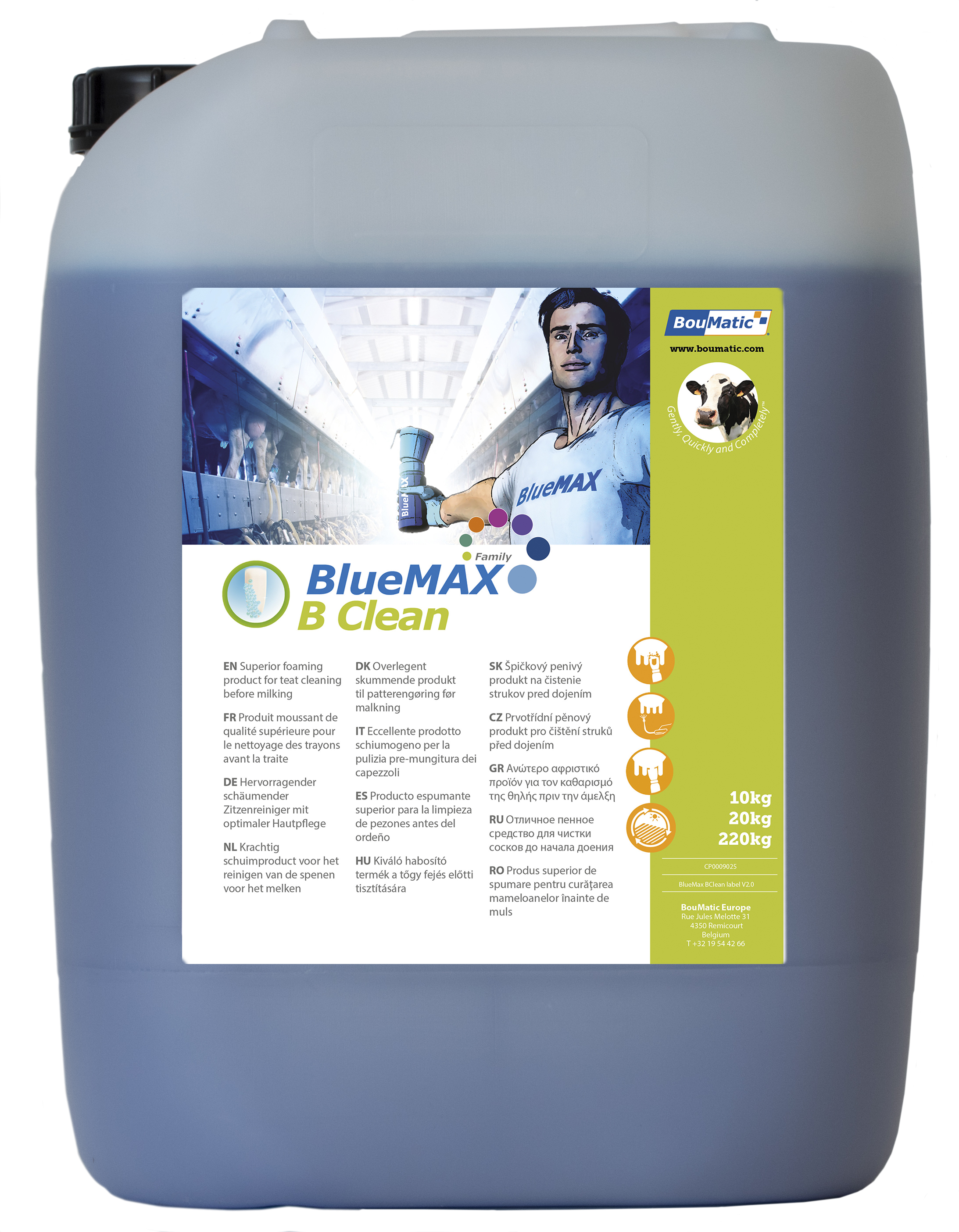 Το BlueMAX B Clean είναι το καλύτερο διάλυμα με αφρό, για εμβύθιση των θηλών πριν το άμρεγμα, που διατίθεται στους κτηνοτρόφους. Επιταχύνει τη διαδικασία προετοιμασίας της θηλής και αφαιρεί το χώμα και τις βρωμιές γρήγορα και αποτελεσματικά.